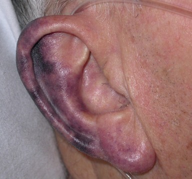 Purpura resulting from blood vessel fragility appears clinically as ecchymoses, that is, purpuric macules of more than 3 mm in diameter ( Fig. 17.1 ). Dermal tissue atrophy resulting from sun exposure and aging is the most common cause. Blood thinners such as low-dose aspirin also lead to additive susceptibility.