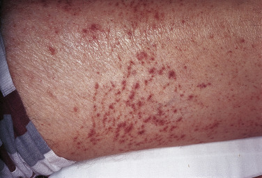 Purpura is a generic term for visible hemorrhage in the skin and mucous membranes. More specific terms describe particular types of purpura, and subtyping purpura is essential for an efficient diagnosis. The term petechia generally implies an area of hemorrhage 4 mm or less in diameter ( Fig. 15-1 ). An ecchymosis is a deep reddish-blue, purplish, or blue-black macule, usually at least 1 to 1.5 cm in its greatest dimension. As used in this chapter, the terms petechiae and ecchymoses are also restricted to lesions that are macular (nonpalpable) and without a blanchable component, consistent with simple hemorrhage. A contusion is a major trauma-induced lesion that may be purpuric, and frequently has trauma-related soft-tissue swelling and tenderness. The traditional term palpable purpura is best applied to a lesion that is partially but not completely blanchable, implying a component of early inflammation. Retiform or branching purpura is a term that describes hemorrhage, which may be inflammatory or noninflammatory, but is characterized by a distinctive shape, with branching or reticulate patterning of the whole lesion or of its edges. Noninflammatory retiform purpura most characteristically is due to microvascular occlusive disease in the skin.