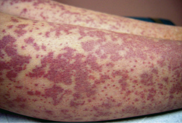 Inflammatory hemorrhage should include only those disorders in which vessel-directed inflammation is evident. Perivascular inflammation that is not vessel-directed should not be considered vasculitis, and it does not result in palpable purpura, the hallmark but not universal lesion of inflammatory hemorrhage. Lesions of palpable purpura are characterized by a port-wine color, incomplete blanching on pressure or diascopy, and palpability ( Fig. 15-2 ). Partial blanching of an early lesion is an important physical finding, with erythema correlating with inflammation and purpura with hemorrhage. Such lesions, when due to immune complex deposition, usually develop first in dependent areas, which in a bedridden patient may be the back and buttocks. An important cause of palpable purpura is small-vessel leukocytoclastic vasculitis, which has a variety of causes, including idiopathic, postinfectious, and drug-related; IgA-predominant vasculitis (Henoch–Schönlein purpura); mixed cryoglobulinemia; connective tissue disease, such as systemic lupus erythematosus and rheumatoid arthritis; and granulomatosis with polyangiitis (GPA), formerly Wegener’s granulomatosis, or allergic granulomatous polyangiitis (AGA) of Churg–Strauss s with or without granulomatous changes. However, the physical findings of palpable purpura may occasionally result from disorders in which vessel-directed inflammation is caused by a predominantly mononuclear cell infiltrate, as in erythema multiforme, and the pityriasis lichenoides group (especially PLEVA [pityriasis lichenoides et varioliformis acuta] syndrome). Patients with the aforementioned conditions who have leukocytoclastic vasculitis demonstrable in young cutaneous lesions may have biopsy specimens from older or treated lesions that show only perivascular lymphocytes.