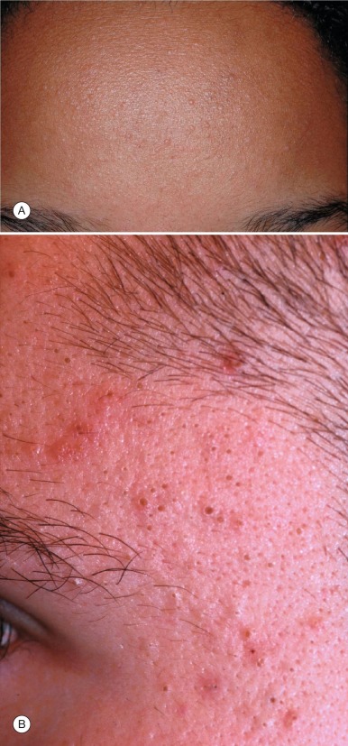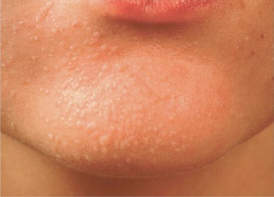 Angiofibromas, a skin manifestation of tuberous sclerosis, are often incorrectly diagnosed as acne. Clinically, the lesions appear as firm, pink papules that are clustered primarily in the center of the face, are persistent, and are, of course, resistant to acne therapy. Keratosis pilaris, when it affects the facial cheeks, is distinguished from acne by its minute, rough, uniform papules on the background of “red” (e.g., prominent skin vasculature) skin and by its lack of comedones. Keratosis pilaris is a chronic condition and relatively unresponsive to acne treatments.