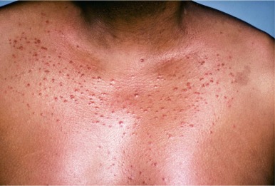 Steroid acne is caused by use of corticosteroids and is distinguished from acne vulgaris by its sudden onset (usually within 2 weeks of starting high-dose systemic or potent topical corticosteroid therapy) and appearance (uniform, 2- to 3-mm, red, firm papules and pustules) ( Fig. 12.6 ). Steroid acne caused by topically applied agents occurs most often on the face. With systemic corticosteroids, the eruption is most prominent on the upper trunk.