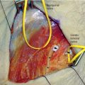 If access to only the very most proximal portion of the radial nerve is required, that is, at the level of its takeoff from the posterior cord to its egress through the triangular interval, the patient may be placed in the supine position. The approach to this portion of the radial nerve is via a standard infraclavicular incision described in detail in Chapter 1. An incision is laid out along the lateral two thirds of the clavicle and down onto the deltopectoral groove (Fig. 5-1). The skin should be infiltrated with a vasoconstrictive agent such as lidocaine 1% with epinephrine in a 1:100,000 concentration prior to incision. The skin and subcutaneous tissue are then divided exposing the deltopectoral groove (Fig. 5-2). The deltopectoral groove is opened, the cephalic vein ligated, and the tendon of the pectoralis minor muscle is exposed (Figs. 5-3 and 5-4). The pectoralis minor tendon is retracted after being divided and tagged for reapproximation at the conclusion of the procedure. Once retracted the lateral cord and the adjacent axillary artery are visible (Fig. 5-5). The lateral cord is seen to divide into the musculocutaneous nerve to the biceps and the lateral cord contribution to the median nerve (Fig. 5-6). For full exposure of the radial and/or axillary nerve of the posterior cord, the lateral cord may require retraction in a medial direction. It is therefore prudent to dissect free the musculocutaneous nerve so that it is not unduly retracted or injured beneath a retractor when exposing the posterior cord. The posterior cord is then dissected free from just medial and posterior to the lateral cord (Fig. 5-7). The posterior cord is then seen to divide into the axillary nerve and the radial nerve (Fig. 5-8). The radial nerve then continues on out of the axilla via the triangular interval between the medial and long head of the triceps muscle. If exposure much beyond this interval is required, a posterior approach to the radial nerve is necessary.