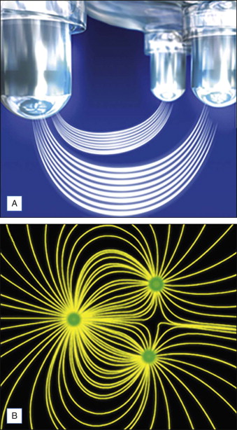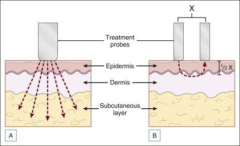 Historically speaking, RF devices were either monopolar or bipolar. Monopolar describes a system in which the electric current is dispelled by a handpiece into the skin and exits the body through a grounding pad. This allows for deep penetration and was initially utilized in electrosurgery. Safety concerns and high pain levels may be associated with this type of device. Bipolar describes a system in which electric current moves between two electrodes at the surface of an intended treatment site. Compared with monopolar systems, they are more limited in the depth they can achieve, which is approximately half the distance between two electrodes ( Fig. 7.2 ).