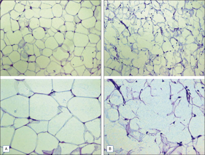 Histologic changes in adipocytes have been reported with additional RF technologies. Trelles et al. employed an automatic multi-frequency and low impedance RF device (ThermaLipo™, Thermamedic Ltd, Alicante, Spain), which emits at a lower frequency (0.6 MHz) to target deeper tissues and at higher frequency (2.4 MHz) for more superficial tissue. Thirty women were treated with this device at the buttocks for at least four passes in order to reach a skin temperature of 42 °C maintained for a minimum of 12 minutes. Skin biopsies were taken prior to and 2 hours after RF treatment and stained with H&E and Oil red O separately. In all samples, adipocytes lost their typically round shape and became more polyhedric and rectangular. Degeneration of the cellular membrane was observed as well as vacuolization of fat and decreased fat. Some cells appeared necrotic.