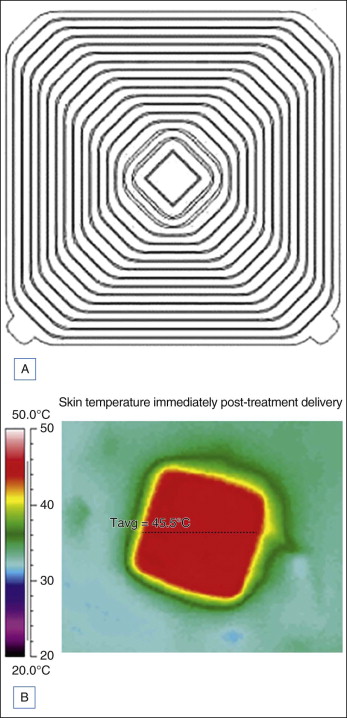 Another recent and unique RF design includes an applicator consisting of a series of tightly spaced concentric rings that are designed to couple energy into tissue across the entire surface of the applicator (truSculpt™, Cutera ® , Brisbane, CA) ( Fig. 7.5 ). The distribution of surface electric potential is controlled by adjusting frequency to create uniform heating at specified volumes. Electric fields are created in a perpendicular manner to the dermal–subcutaneous junction resulting in significant, targeted heating of the fat. This was demonstrated in two subjects in whom temperature probes were inserted at the cutaneous–subcutaneous junction, 7 mm into the subcutaneous tissue, and 12 mm into the subcutaneous tissue during general anesthesia induced for planned abdominoplasty. The truSculpt device was applied for 3 minutes and probes reported that the temperature of the cutaneous–subcutaneous junction remained <30 °C while the temperatures at 7 mm and 12 mm reached 45 °C and 50 °C, respectively. Resulting subcutaneous changes are shown by another phase of the same study in which three patients were treated for 22 minutes prior to abdominoplasty and then underwent biopsies of the treated sites. Epidermal and dermal structures were normal in all biopsies and the subcutaneous tissue appeared normal immediately after the procedure. Yet, beginning at day 4, adipose tissue showed vascular alterations including purpura, congested vessels and increased vascularity. Adipocyte necrosis was noted at day 9 in one patient and at days 17 and 24 in a second patient while increased macrophages and foamy histiocytes were noted on day 10 in a third patient. The authors suggest that fat is disposed of and therefore volumetrically decreased by phagocytosis in a gradual manner that does not lead to hyperlipidemia.