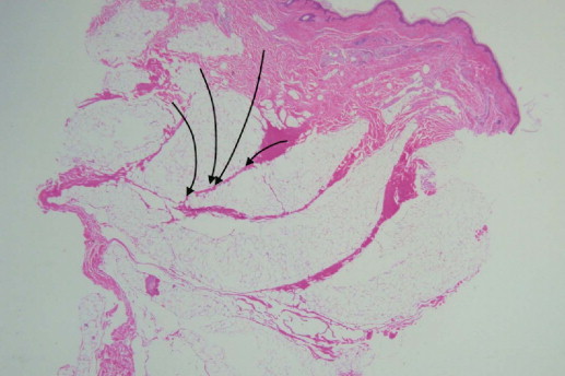 Slide demonstrating treated cadaver integument at high energy levels with the dark red staining indicating selective thermal heating of fibrous septae (arrows) and avoidance of fat cells. Human forehead cadaver study.