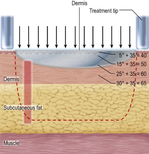 Thermage, Inc. (Hayward, CA) developed a monopolar RF delivery system that included a unique capacitive coupling device that permitted uniform energy distribution across the entire electrode surface with subsequent volumetric tissue heating. The ThermaCool™ device delivers RF energy with a maximum fluence of 225 J/cm 2 , though the upper limit for facial skin without coagulation or burning at the electrode–skin interface is 140 J. The tissue is heated in a uniform fashion with peak temperatures centered approximately 2–3 mm beneath the surface. Tissues are heated to 55–75°C which is the critical temperature for collagen denaturation ( Figure 6.2 ).