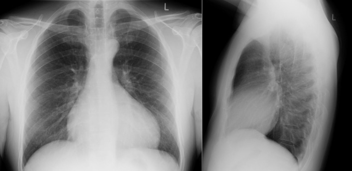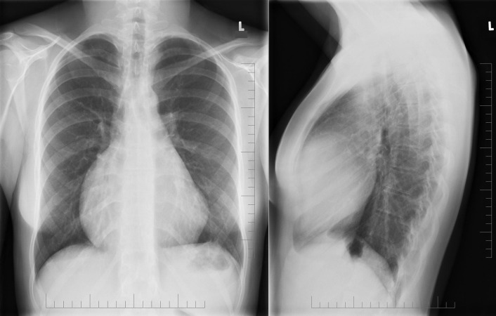 Ebstein’s anomaly. Note the moderate cardiomegaly, the prominence of the right atrium and right ventricle as well as the small main pulmonary artery.