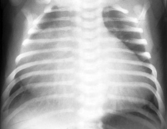 In this chest radiograph in an infant, there is gross cardiomegaly, particularly of the right-sided contours due to Ebstein’s anomalies.
