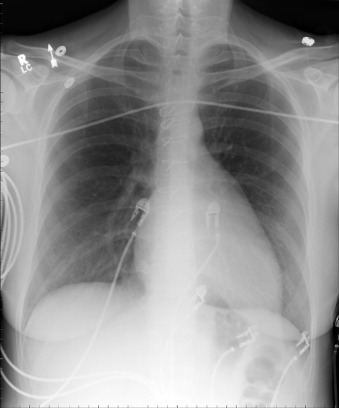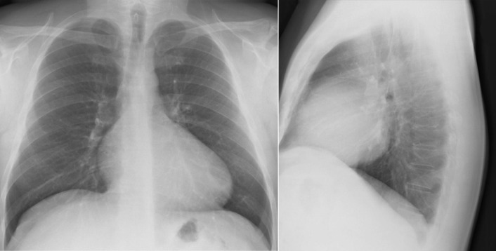There is cardiomegaly with prominence of the right atrial contour, a small main pulmonary artery due to rotation of the heart due to Ebstein’s anomalies. The patient had previously undergone surgical repair of an associated atrial septal defect.