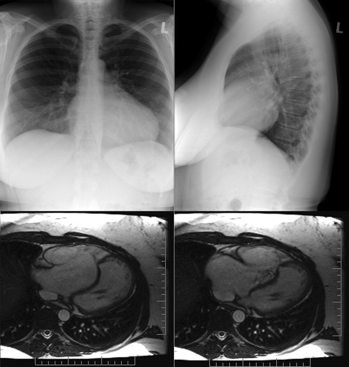 Chest radiographs and cardiac magnetic resonance (CMR; steady-state free precession [SSFP]) images of a patient with Ebstein’s anomaly. Note the signs of right heart chamber enlargement, the raised apex, and the small pulmonary artery. The CMR images reveal the atrialization of the right ventricle, marked enlargement of the right atrium and atrialized ventricle, and tricuspid regurgitation.