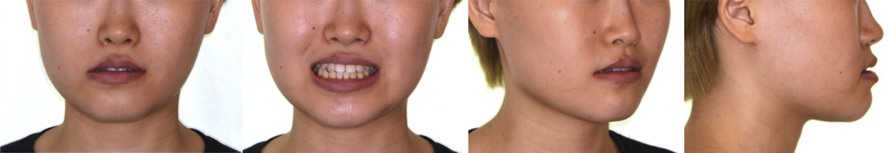 A 19-year-old female patient presented with the chief complaint of jaw protrusion and facial asymmetry. On a clinical examination, a midface deficiency with chin protrusion was observed ( Fig. 2 ). According to the intraoral photographs, an edge-to-edge bite with anterior open bite tendency was observed ( Fig. 3 ). Both the left and the right first molars showed a class III relationship, and the lower dental midline was deviated 2.5 mm to the right from the facial midline. In her smile photograph, a flat smile arc was observed.