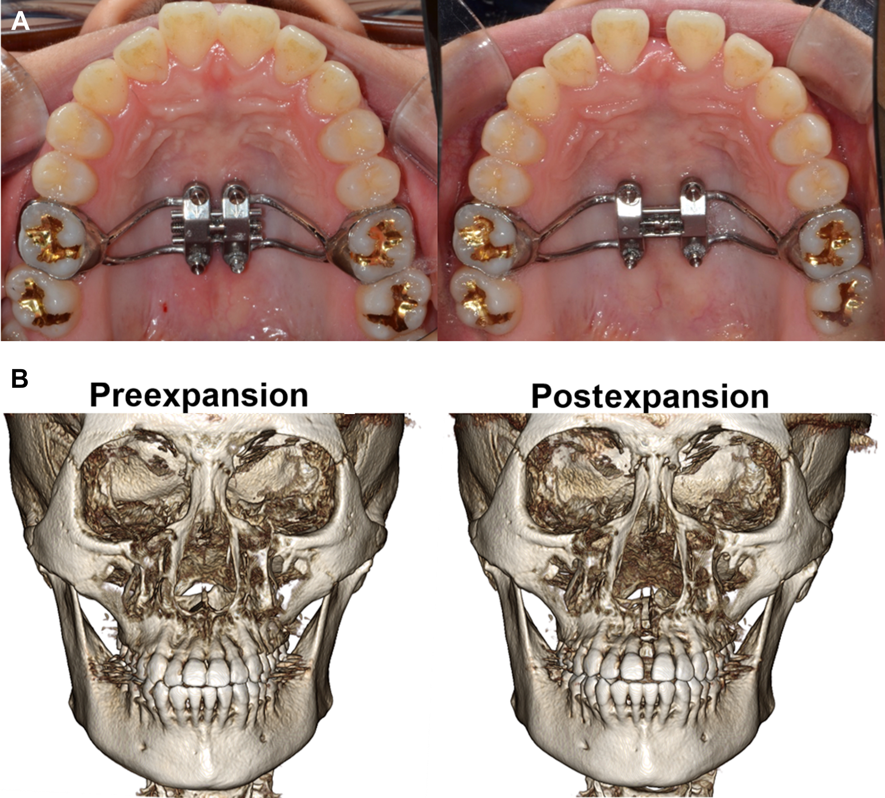 Maxillary expansion was performed to correct the narrow maxilla. ( A ) MARPE was performed with 4 miniscrews installed in the midpalatal suture. The expansion rate was 1/6 mm per day, and a total of 6 mm was expanded in the maxilla. The appliance was retained for 3 months. ( B ) CBCT of the patient before and after MARPE.
