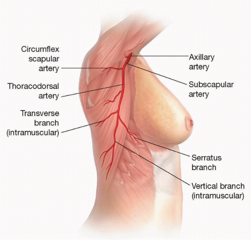 The TD vessels are commonly divided for microvascular anastomosis just proximal to the serratus branch where the diameter of the artery is approximately 3 mm.5 Preservation of the serratus branch also allows for the use of a pedicled latissimus dorsi flap and an implant for breast reconstruction in case free tissue transfer is unsuccessful.