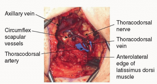 If immediate reconstruction following mastectomy and axillary lymph node dissection is performed, the TD vessels are often already partially exposed and may be considered for anastomosis. However, the vessels must be carefully inspected for any injury or spasm resulting from the extirpation surgery. Additionally, the flap pedicle must be of sufficient length to reach the TD vessels for anastomosis.