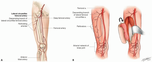 FIG 1A. Arising from the produnda femoral trunk, the lateral circumflex femoral artery (LCFA) gives three branches: ascending, transverse, and descending branch. The descending branch of LCFA travels deep with the space between the rectus femoris muscle and the vastus lateralis muscle. As traveling distally, it distributes the perforators, in most cases musculocutaneous perforators to the flap. B. The distal communicating artery between the descending branch of LFCA and the lateral superior geniculate artery is the anatomic basis for the reversed ALT flap.