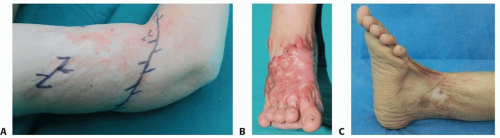 FIG 2A. For a superficial nonhypertrophic scar on right arm with minimal contracture, the simple technique of Z-plasty will release the contracture scar and break the tension line. B. For this patient, skin grafting is needed to replace the unwanted hypertrophic scar on the dorsum of the right foot and to release the dorsal contracture of the second, third, and fourth toes. C. Both the Z-plasty and skin grafting are needed to fully release the contracture bands of the left ankle and foot.