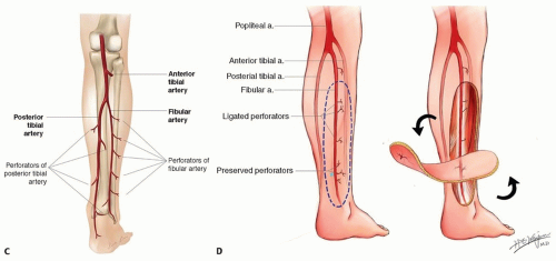 • Perforator flaps based on the peroneal artery or posterior tibial artery (FIG 1C) are powerful tools to repair the defects around the ankle joint and the heel (FIG 1D).