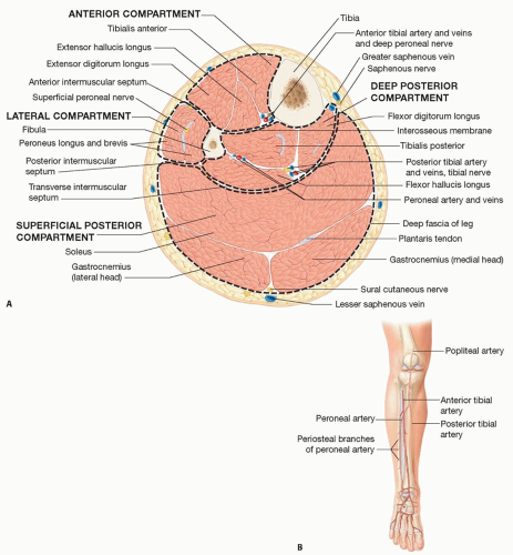 Musculoperiosteal vessels are derived from the peroneal artery and travel within the posterolateral septum, through the FHL and tibialis posterior muscle, giving segmental rise to four to eight branches that supply the muscles in the anterior compartment, soleus muscle, and lateral leg skin territory. The majority of the periosteal branches are located in the middle third of the fibula (FIG 1).