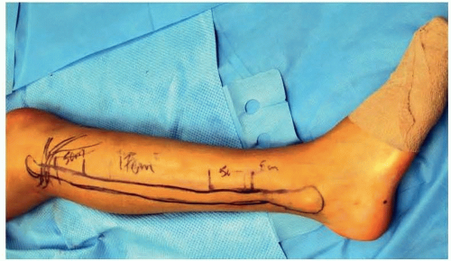 Prior to incision, anatomical landmarks including the head of the fibula, lateral malleolus, and anterior and posterior border of the fibula are marked. The posterior border of the fibula correlates with the posterior intermuscular septum encasing the vascular supply to the skin paddle (FIG 3).