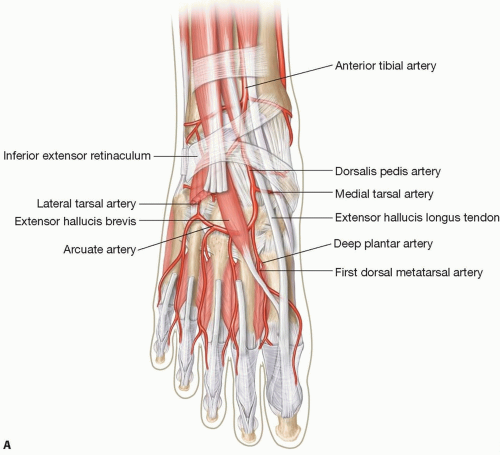 Anterior tibial-dorsalis pedis artery: the dorsalis pedis artery passes under the extensor retinaculum at the midpoint between the medial and lateral malleoli. It usually runs across and beneath the extensor hallucis longus (FIG 1A). It passes to the proximal end of the first intermetatarsal space, where it turns into the sole between the heads of the first dorsal interosseous to complete the plantar arch and provides the first plantar metatarsal artery