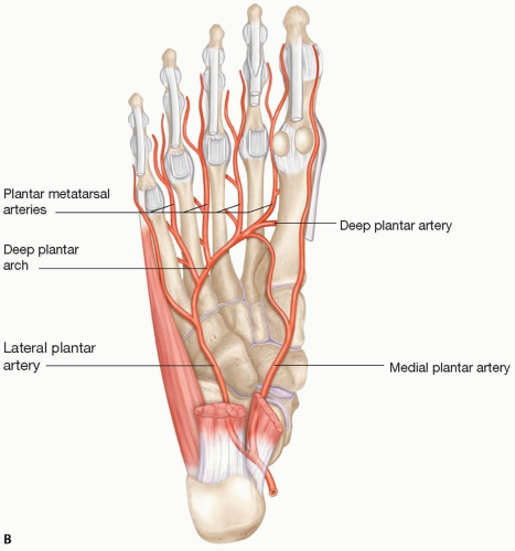 tibial artery divides into the medial and lateral plantar arteries under the origin of the abductor hallucis. While the medial plantar artery runs between the abductor hallucis and flexor digitorum brevis (FIG 5), the lateral plantar artery, being usually larger, travels from medial to lateral position under the proximal third of the flexor digitorum brevis and then continues distally between flexor digitorum brevis and abductor digiti minimi (FIG 6).