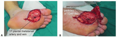 (FIG 1B). In heel and plantar reconstruction with a free flap, the dorsalis pedis artery can be reached for the recipient vessel by using a remote incision and subcutaneous tunneling (FIG 2). The first plantar metatarsal artery can be used in the plantar forefoot reconstruction (FIG 3).