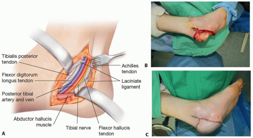 Posterior tibial-medial and lateral plantar artery: posterior tibial artery runs midway between the medial malleolus and the medial calcaneal tubercle under the laciniate ligament. It is located between the flexor digitorum longus and flexor hallucis longus tendons (FIG 4). The posterior