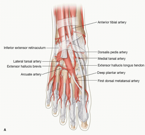 Anterior tibial-dorsalis pedis artery: the dorsalis pedis artery passes under the extensor retinaculum at the midpoint between the medial and lateral malleoli. It usually runs across and beneath the extensor hallucis longus (FIG 1A). It passes to the proximal end of the first intermetatarsal space, where it turns into the sole between the heads of the first dorsal interosseous to complete the plantar arch and provides the first plantar metatarsal artery