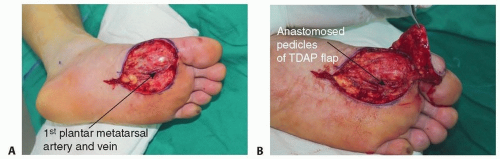 (FIG 1B). In heel and plantar reconstruction with a free flap, the dorsalis pedis artery can be reached for the recipient vessel by using a remote incision and subcutaneous tunneling (FIG 2). The first plantar metatarsal artery can be used in the plantar forefoot reconstruction (FIG 3).