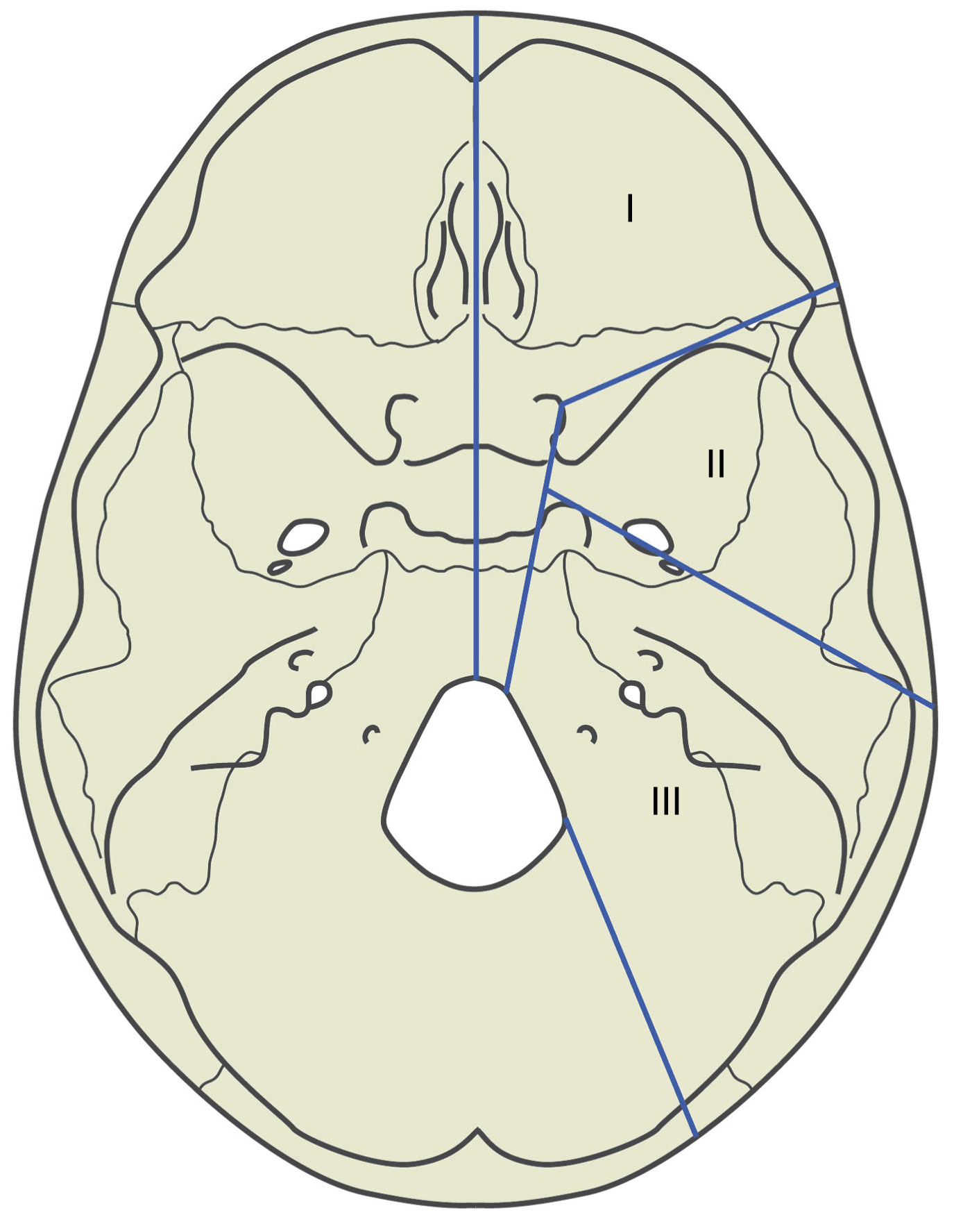The skull base separates the extracranial and intracranial anatomy. Located on the extracranial side of the skull base are the sphenoid sinuses, ethmoid sinuses, pterygopalatine fossae, infratemporal fossae, and orbits. On the intracranial side, the skull base forms the anterior, middle, and posterior fossae. Multiple classification systems have been introduced based on anatomic boundaries, pathology, and reconstructive requirements. The Irish classification system has emerged as the most popular, due to its simplicity and clinical utility. Irish and colleagues reviewed 77 cases and divided the skull base into three regions, based on the relationship of the tumor to the anterior, middle, and posterior cranial fossae ( Fig. 27.1 ). In this classification, resections can involve removal of skull base bone with or without removal of the underlying dura.