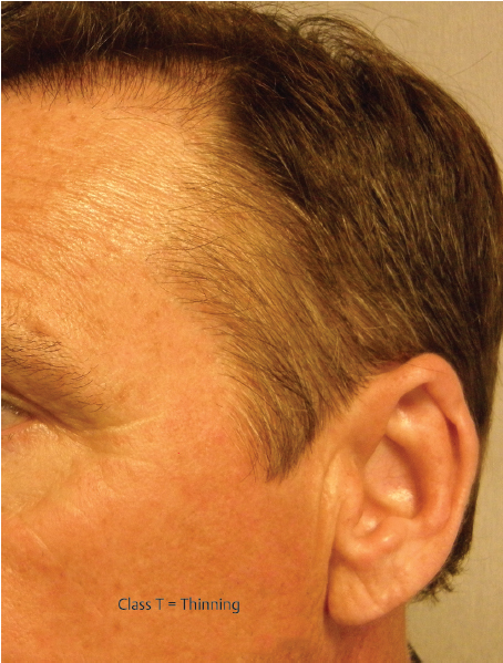 Patients in classes N and T usually require no augmentation. These patients should be encouraged to use finasteride, topical minoxidil, or photobiomodulation (low-level laser therapy) to help prevent further thinning. Platelet-rich plasma (PRP) has been advocated by some, but no significant controlled studies exist that would allow making a specific recommendation. These may be used individually or in combination. Classes P and R should be considered for surgical augmentation. In these two classes, the lower hairline placement increases the need to consider augmentation of the temporal points.4,5