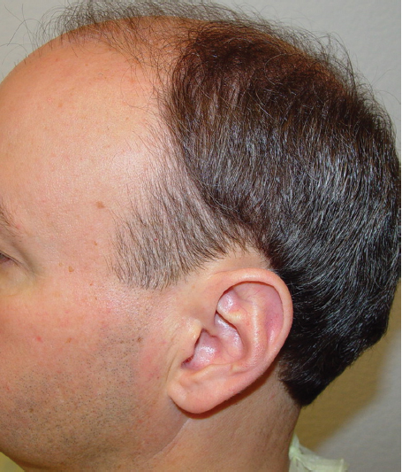 When transplanting in this area, it is critical to make the correct decision regarding anticipated hair loss. One must always try to predict worst-case scenario by evaluating the patient’s age, family history of hair loss, and response or nonresponse to preventive modalities. Dampening the hair allows one to detect more accurately the areas with miniaturization that are affected by 5α-dihydrotestosterone (DHT). As with creating the hairline, conservative judgment is paramount.1,2,3,4,5,6,7,8
