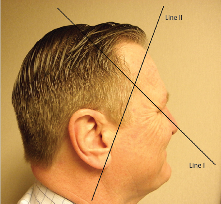 To create proper balance with the frontal hairline, the temporal point is placed where the following two lines intersect (Fig. 41.5): line I is drawn from the tip of the nose, over the center of the pupil (with the patient looking straight ahead) to the anterior tip of the temporal point. Line II is drawn from the most anterior point of the proposed frontal hairline to the tip of the ear lobe.