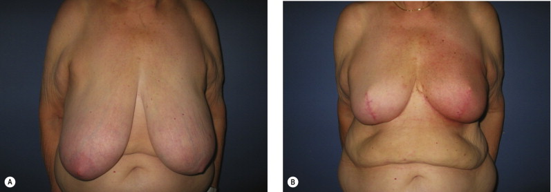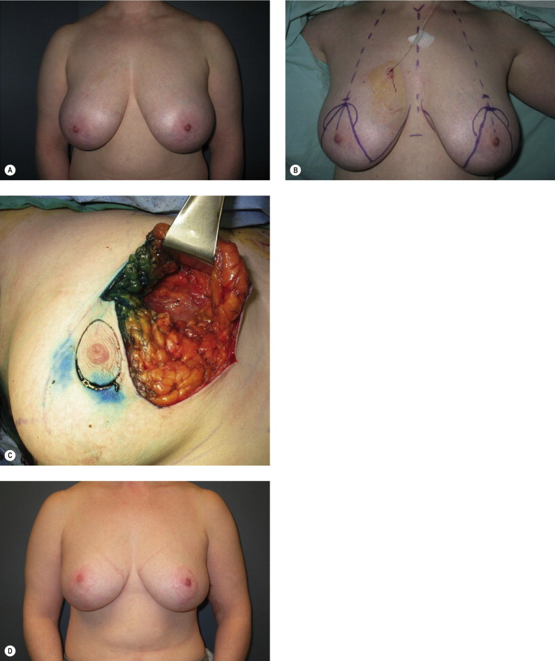 Women with large pendulous breasts who are felt by the surgeon to be poor candidates for BCT alone benefit from the oncoplastic reduction techniques, minimizing the potential for a poor cosmetic result and allowing them to be candidates for breast conservation ( Fig. 6.1 ). The ideal patient is one whose tumor can be widely excised within the reduction specimen, and for whom a smaller breast is viewed as a positive outcome. Older women with macromastia are well suited for this approach compared to mastectomy and reconstruction ( Fig. 6.2 ). Another indication for the oncoplastic reduction technique is when the surgeon anticipates a large defect, or is concerned about being able to achieve clear margins in women with moderate to large breasts. The potential for an unfavorable result exists in this situation regardless of breast size or tumor location. Other indications are patient driven, in those women who desire breast conservation, or who desire smaller breasts due to their limitations caused by symptomatic macromastia. As we become more comfortable with these techniques, the indications will become more liberal. Essentially anyone with large breasts amenable to breast conservation is a candidate for this procedure. However, the importance of stringent patient selection criteria cannot be overstated, and is required to ensure maximal cosmetic outcomes as well as oncological safety.