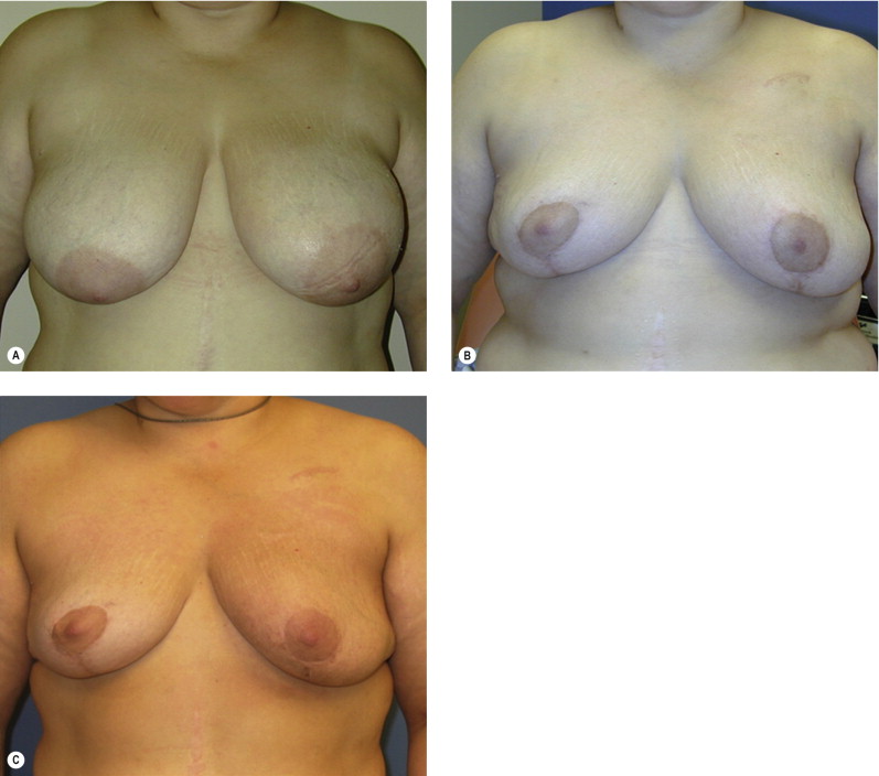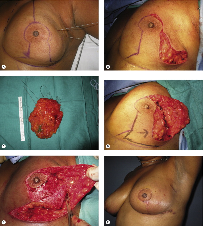 The Wise pattern markings are more versatile and allow easy access to tumor location anywhere within the breast mound. They also give more options to reconstruct the defect using glandular flaps. If it is unclear whether glandular flaps will be required to reconstruct the defect, the standard Wise flaps can be elevated about 1 inch thick up to the chest wall without resecting any additional breast tissue or skin. Numerous options will then exist for either primary or secondary pedicles to keep the nipple alive or fill the defect with the skin flaps, then redraped over the mound to complete the reconstruction. The vertical type reduction or mastopexy is useful for smaller breasts, when the defect can be easily accessed through this approach.