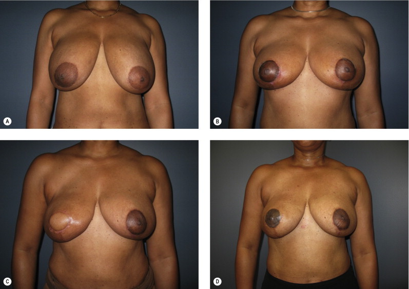 One of the most important variables in ensuring a safe oncologic outcome is patient selection and how it relates to margin status. Positive margins on final pathology are potentially complicated by altered architecture. The options for managing positive margins include re-excision or completion mastectomy and reconstruction. The extent of the disease in these situations, especially given the previous generous oncoplastic resection, will often dictate that completion mastectomy is a more appropriate treatment plan. If re-excision is performed, this needs to be done with the reconstructive surgeon. Fortunately, the incidence of positive margins using this approach is felt to be less given the more generous resections. We have demonstrated an average specimen weight over 200 g in oncoplastic resections, compared to about 50 g for non-oncoplastic procedures ( Fig. 6.3 ). The incidence of positive margins is lower in oncoplastic resections. When completion mastectomy and reconstruction are required, the disadvantages of the reduction procedure are minimal. The benefits of this approach are that (1) no reconstruction options (i.e., flaps) have been used, (2) the contralateral symmetry procedure has already been performed, (3) skin envelope has been reduced, and (4) it is now easier to reconstruct a smaller reduced breast than a large ptotic one ( Fig. 6.4 ).