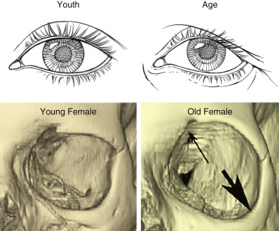 In a more comprehensive study by Kahn and Shaw, 60 white patients (30 female, 30 male), underwent facial bone computed tomography (CT) scans to demonstrate how specific bony aspects of the orbit change with age. The study population included 10 male and 10 female patients from each of the three age categories: young (25–44 years), middle (45–64 years), and old (65+ years). CT scans underwent three-dimensional reconstruction with volume rendering. The results, illustrated in Fig. 13.1 , concluded that, with age, bony changes and soft tissue consequences occur. These include the following: