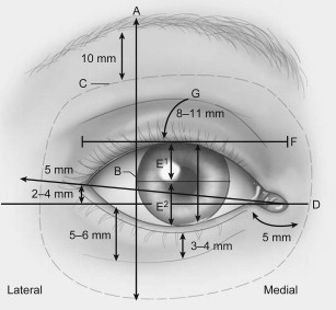 Fig. 1 depicts many anatomic relationships that must be understood when evaluating the eyelid and assessing what needs to be addressed to restore youthfulness. The lateral canthus is typically 2 to 4 mm superior to the medial canthus. The adult palpebral fissure averages 10 to 12 mm vertically and 28 to 30 mm horizontally. The distance from the lateral canthus to the orbital rim is typically 5 mm. At rest, the upper eyelid covers the superior limbus by 1 to 2 mm. The highest point of the upper lid margin is just nasal to a vertical line drawn through the center of the pupil. This contour should be noted preoperatively when evaluating patients for rejuvenation of the upper eyelid so it can be addressed during surgery to create a more aesthetic and appropriate lid position. The upper lid crease lies 8 to 11 mm above the lash line in whites but this varies with ethnic background. In Asians, the upper lid crease may be lower or absent owing to the lower insertion of the septum and variable or absent insertion of the levator aponeurosis into the upper lid skin.