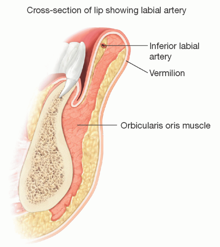 Arterial supply is through the facial artery branching into the superior and inferior labial arteries. These run just deep to the mucosa in the submucosal layer just deep to the orbicularis oris muscle, at the level of the mucosal-vermilion junction (FIG 1).
