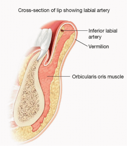 Arterial supply is through the facial artery branching into the superior and inferior labial arteries. These run just deep to the mucosa in the submucosal layer just deep to the orbicularis oris muscle, at the level of the mucosal-vermilion junction (FIG 1).