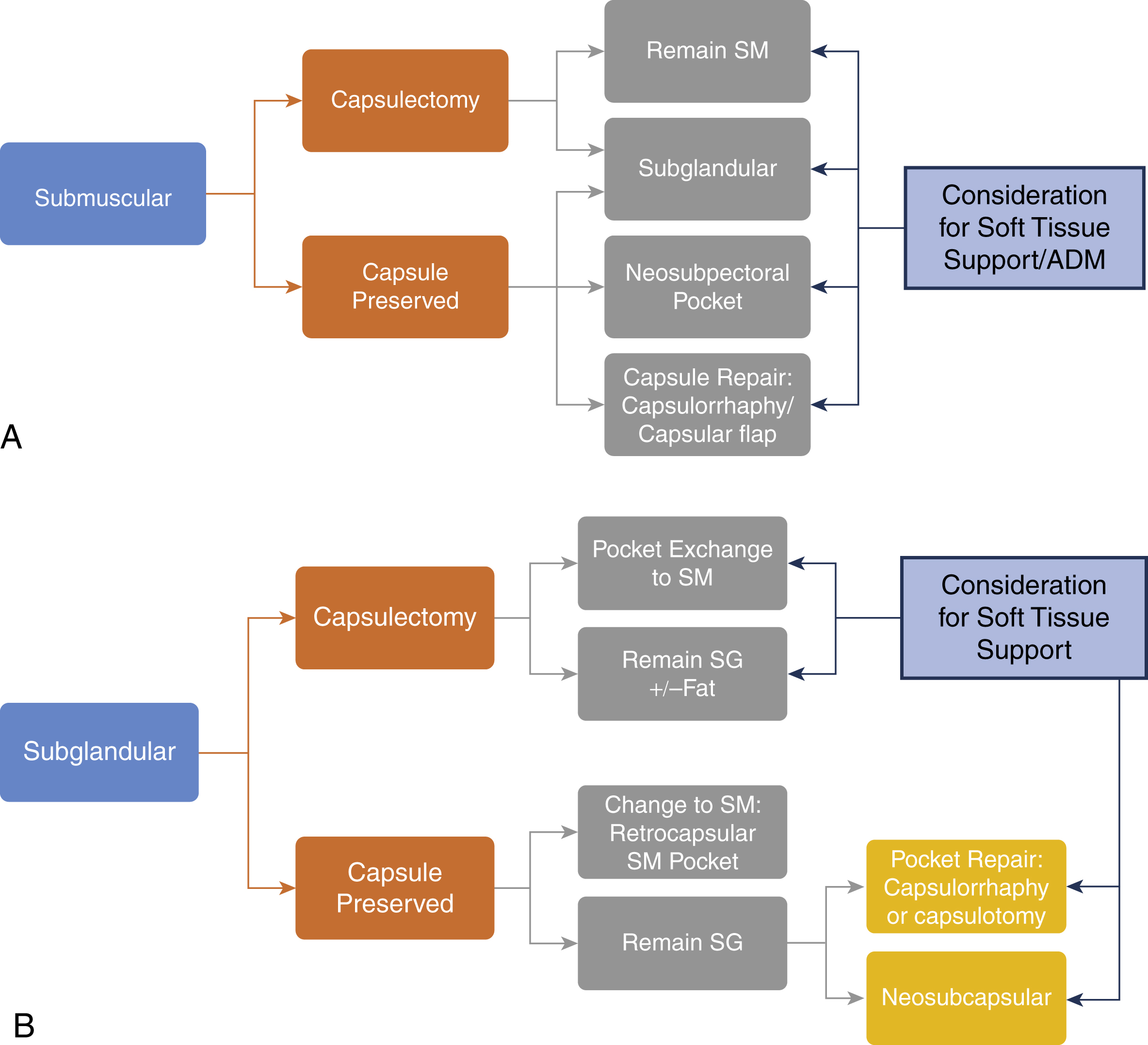 Additionally, it is important to determine pocket placement for the new breast implant. When subglandular, a pocket exchange to a submuscular pocket is commonly performed to create a new pocket. The submuscular pocket is associated with lower capsular contracture rates, provides often much needed additional soft tissue coverage over the implant, and creates a pocket with potentially less bioburden from overlying breast tissue. For all secondary breast cases, we developed an algorithm to guide our pocket decisions for these difficult cases ( Fig. 11.1A, B ).