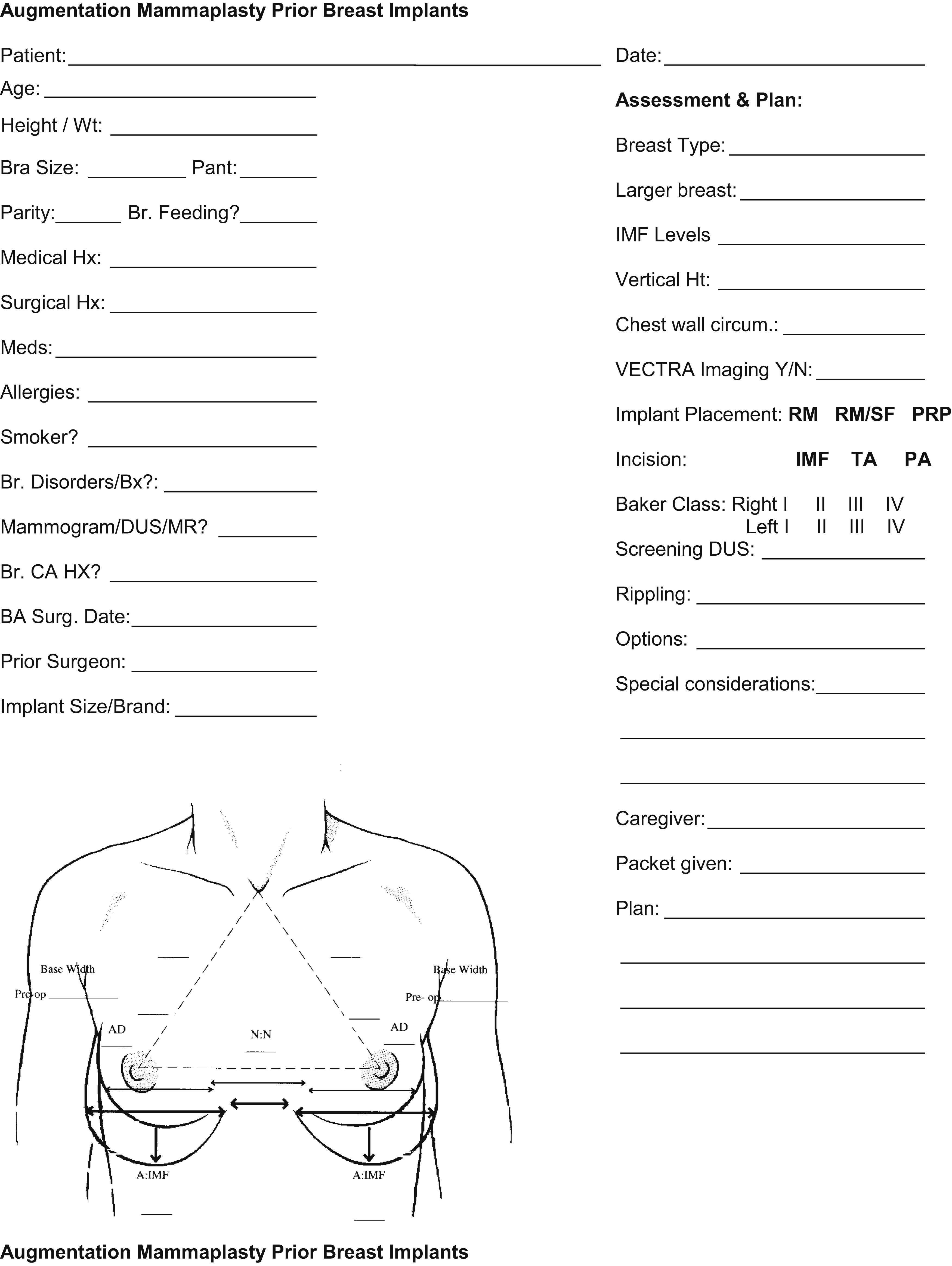 The female breast is a dynamic structure, with changes that occur naturally during a woman’s life and secondary to the presence of breast implants placed for augmentation. Successful maintenance surgery should follow a similar process that the surgeon has for primary breast augmentation, with a few other considerations. Patient evaluation templates ( Fig. 8.1 ) are useful to record measurements, patient data, implant data, and planning.