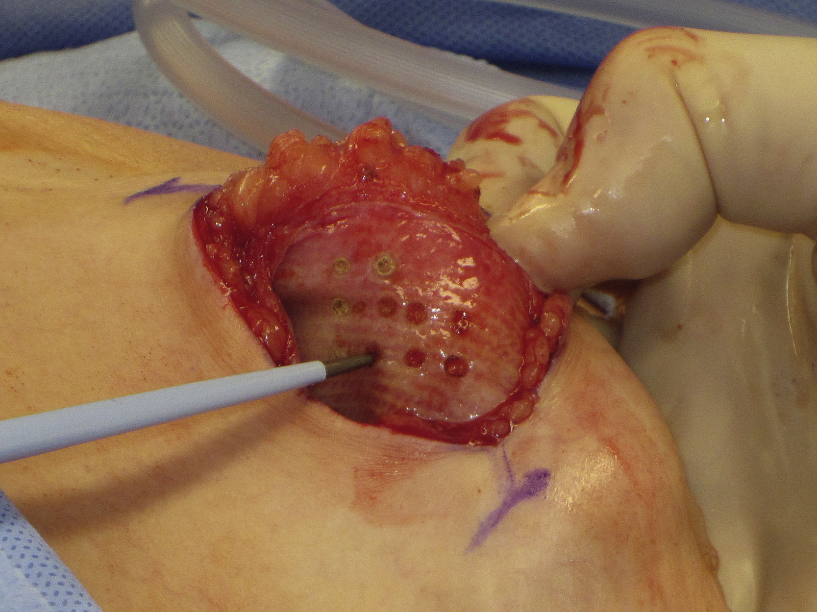 It is straightforward to find replacement implant choices that match the engineering specifications of the patient’s existing implants. Subtle changes in volume (plus or minus) may be possible but may require a capsulotomy for larger size implants. The use of newer-generation, highly filled, round silicone gel implants permits correction of rippling and the unnatural feel of saline. The only caveat here is to be careful when planning surgery to have the replacement implant match the engineering specification of the BD to fill the width of the pocket and avoid a possible implant flip-over or mismatch between replacement implant size and pocket capacity. A “popcorn” capsulorrhaphy with the electrosurgical pencil may be useful to decrease pocket capacity somewhat if the patient requests replacement with a smaller implant ( Fig. 8.2 ).