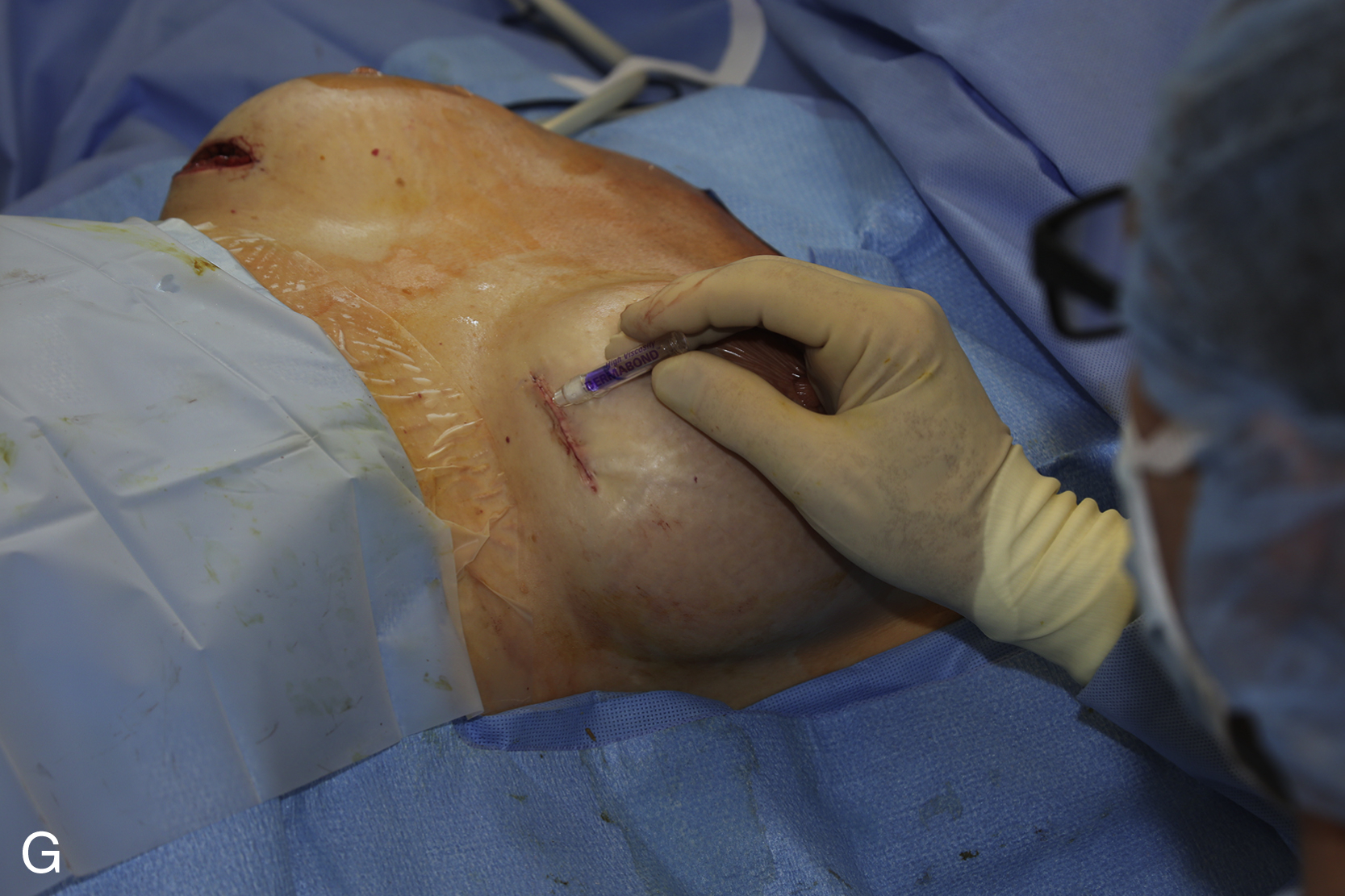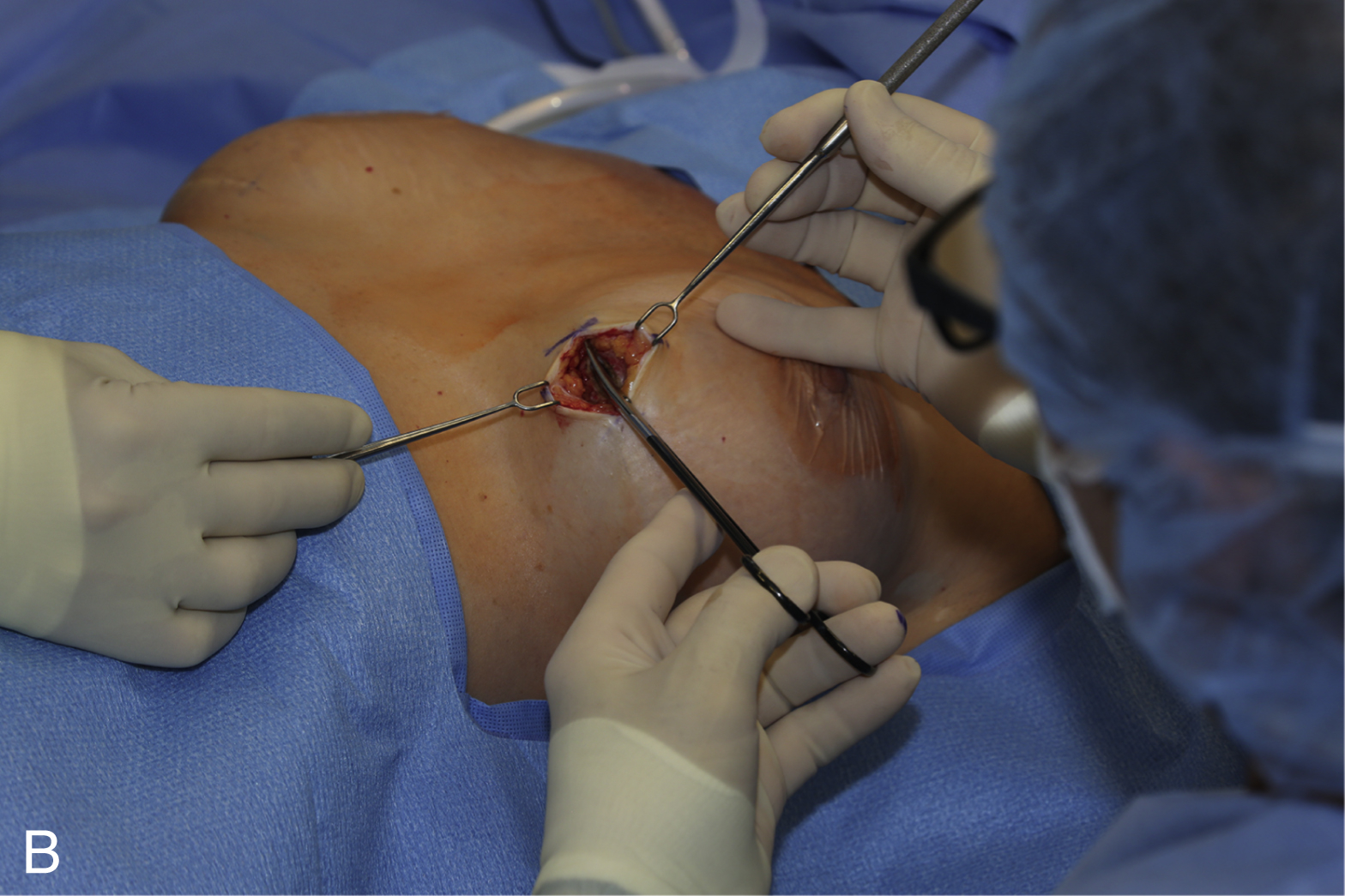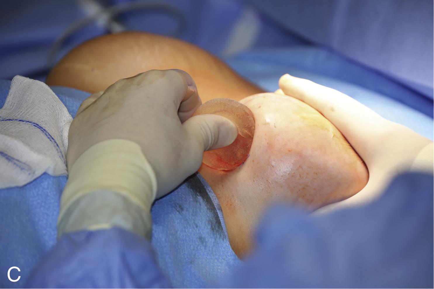 Insertion of the new implants follows a standard technique designed to prevent biofilm contamination of implants (glove change, “no-touch” technique, use of anti-infectives [antibiotics and povidone-iodine [Betadine], and an insertion device). The replacement implants should go in one time only. If consideration for size change and possible capsulotomy are planned, use a sizer implant and measure the pocket dimensions internally. Wound closure with an absorbable monofilament suture and a skin glue finishes the procedure. Drains are not necessary, unless there has been extensive capsule work.
