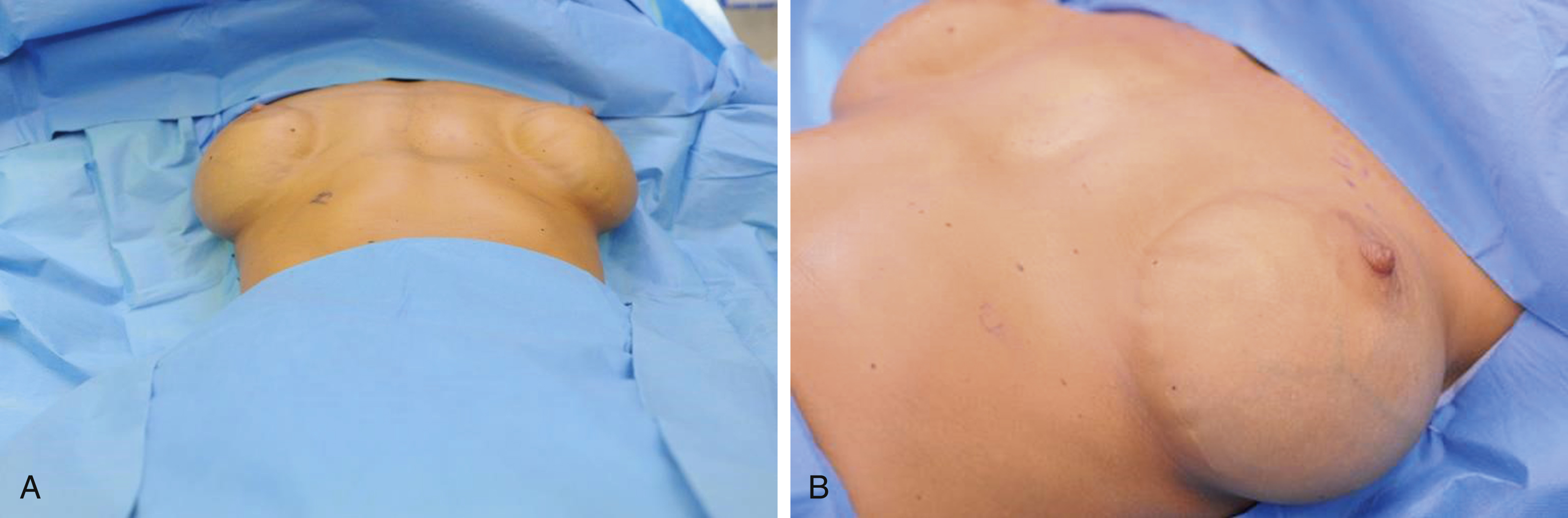 (A, B) Lateral malposition is particularly common and prominent in prior transaxillary, non-endoscopic approach with saline implants and a lateral chest wall descent.