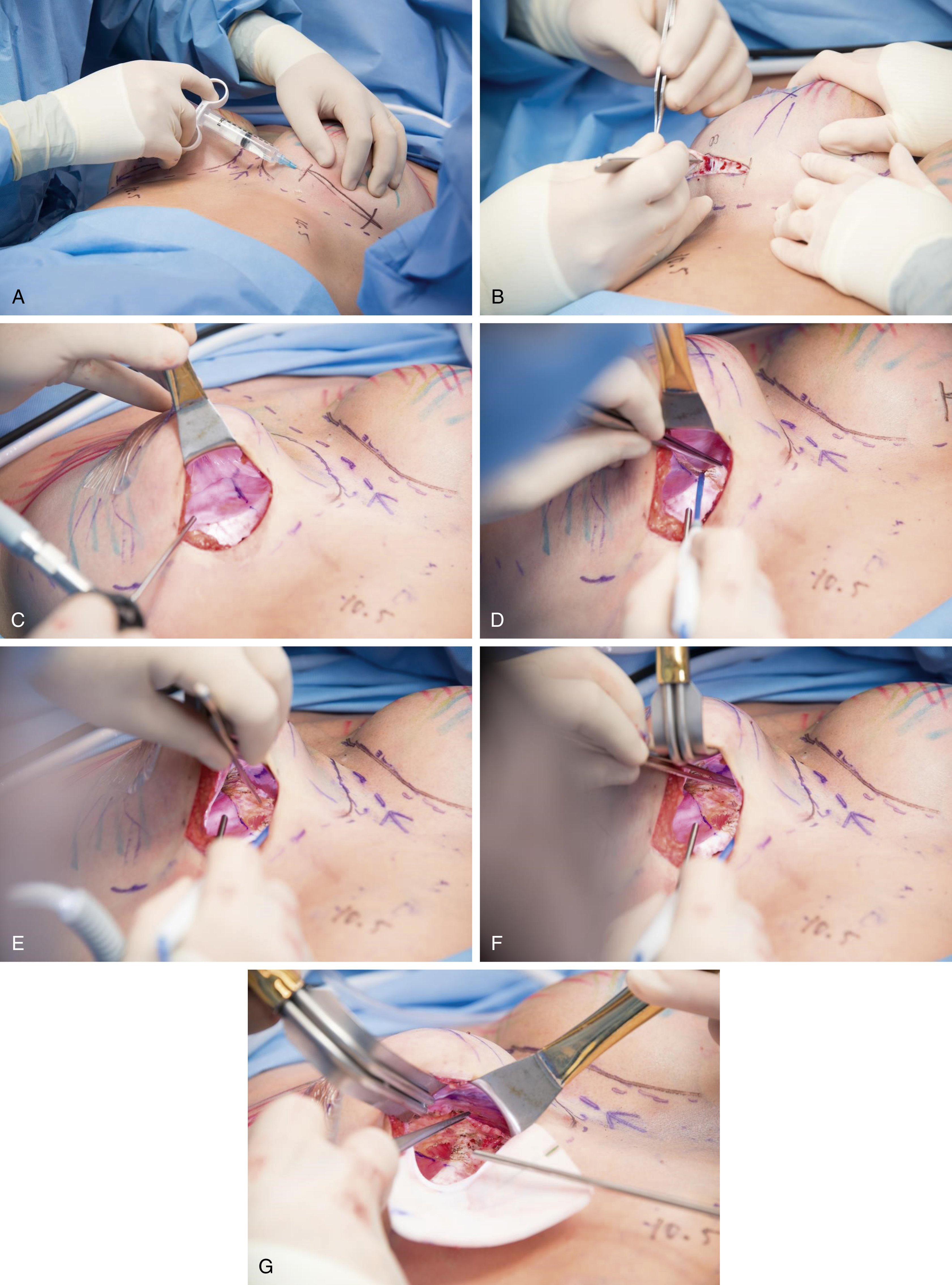 The procedures of preoperative marking, surgical exposure with capsular flap elevation, and in-setting are performed mainly through a 7- to 8-cm inframammary fold (IMF) incision. The implant is removed and the pocket inspected. The new implant width/diameter to be used in the revision as noted, and the soft tissues are manually pressed externally to visualize the approximate location of the new breast pocket. It is important to centralize the new implant to the new pocket. Marks are placed medially and laterally on the posterior pocket, outlining the new pocket dimensions. Marks are made 5–6 cm medial to the new lateral pocket line and 5–6 cm lateral to the medial pocket line toward the center of the breast. These lines are then “hockey-sticked,” or angled, out to the axilla (lateral) and toward the sternal notch (medial). Bovie cautery on cut mode through the capsule and then coagulation mode for the dissection are used to elevate the posterior capsular flap. The dissection is fast, nearly without bleeding, with the flap elevated to the new outer flap dimension line. Be very careful not to overdissect past this new pocket line, because it is very easy to overdissect and recreate the deformity. Often in patients with lateral malposition there is a tight capsule medially and vice versa. If this is present, capsulotomy is performed again to the border desired for the new implant, again keeping the implant centrally located in the new breast pocket. The posterior capsule is then sutured and secured to the anterior capsule with either a 2-0 polydioxane suture (PDS) or a 3-0 PDS, depending on the thickness of the anterior tissue. Vicryl suture may be used if preferred. In the case of a significant deformity of greater than 2 cm, scaffold or ADM support is laid into the pocket and sutured from the border of the cut posterior capsule on the deep/underneath side of the reflected capsule and sutured to the capsule again with PDS. This adds significant thickness to the anterior soft tissue surface and also creates a potential pocket for fat transfer if chosen in the future. The new devices are placed after further hemostasis and antibiotic/antiseptic irrigation. Deep breast fascia is then closed with 2-0 PDS and running 2-0 Vicryl and your standard skin closure. Series of flap design and elevation are shown in Fig. 12.6A–J for medial malposition repair and Fig. 12.7A–E for lateral malposition repair.