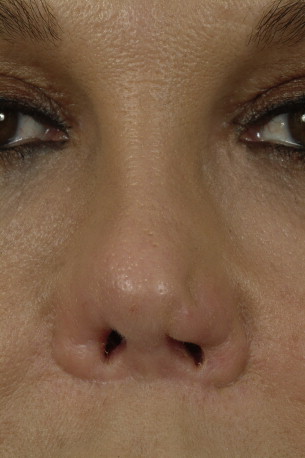 In my experience the most challenging problem in revision rhinoplasty is correction of soft tissue deformities of the nose. These include cases of skin compromise after necrosis or infection ( Fig. 2 ), severe columellar scarring ( Fig. 3 ), severe alar notching ( Fig. 4 ), and over-resection of the alar base ( Fig. 5 ). Some of these deformities are associated with the use of alloplastic implants. In such cases of soft tissue deformity it is very difficult to recreate normalcy to the nose. When addressing soft tissue deformities, damaged soft tissues may need to be replaced. Reconstruction is complicated when these soft tissue deformities are in three-dimensionally complex areas of the nose such as the soft tissue triangle or facets ( Fig. 6 A, B). These areas are very difficult to reconstruction and unfortunately are damaged or deformed from previous surgery more often than I would like to see. To correct these deformities I typically place composite skin cartilage grafts into the site of scar contracture to replace missing vestibular mucosa. This requires creative use of composite grafts taking special care to design grafts to fit the defect and also placement to maximize camouflage of the grafts (see Fig. 6 C–G). Despite placement of structural grafts and composite grafts complete correction is rarely possible. These deformities do not fall into the category of typical deformities seen in revision rhinoplasty such as the pinched nasal tip, inverted-V deformity, saddle nose deformity, polly-beak deformity, alar retraction, over-rotated nasal tip, short nose, hanging columella, and supra-alar pinching. With a normal skin envelope most of these more typical secondary deformities are readily correctable using structural grafting. However, with severe soft tissue defects it is very difficult to completely correct the deformities.