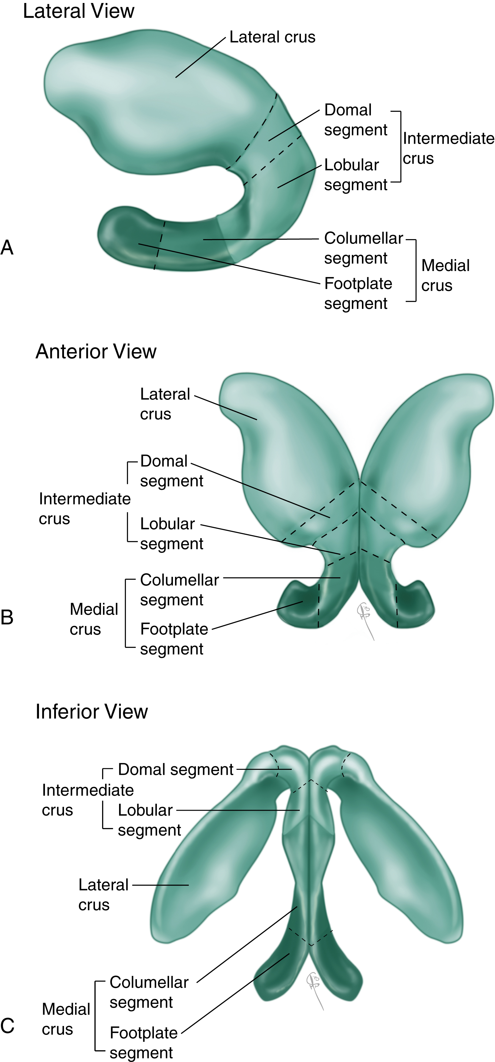 The lower lateral cartilages (LLC) are paired structures in the caudal third of the nose that can be subdivided into three segments: the lateral, intermediate/middle, and medial crura ( Fig. 68.2 ). The lateral crus supports the alar rim. The scroll area is the region where the superior edge of the lower lateral cartilage curls downward as it meets the inferior edge of the upper lateral cartilage. This area provides some support for the internal nasal valve. Superior and lateral to the scroll area, one can find several small sesamoid cartilages connected by fibrous tissue that wraps around the alae laterally. , The intermediate crus has the most variability in shape and may be convex, boxy, broad or concave; it forms the tip-defining point. It should be noted that skin over this region is particularly delicate as there is a deficiency of subcutaneous tissue: the skin directly abuts the perichondrium necessitating meticulous dissection. The medial crura sit next to each other in the columella. The footplate is the area closest to the nasal spine where variable degrees of divergence exist. The columellar segment, the middle portion of the columella, extends towards the intermediate crura where the cartilages may diverge again to reach the tip-defining points.
