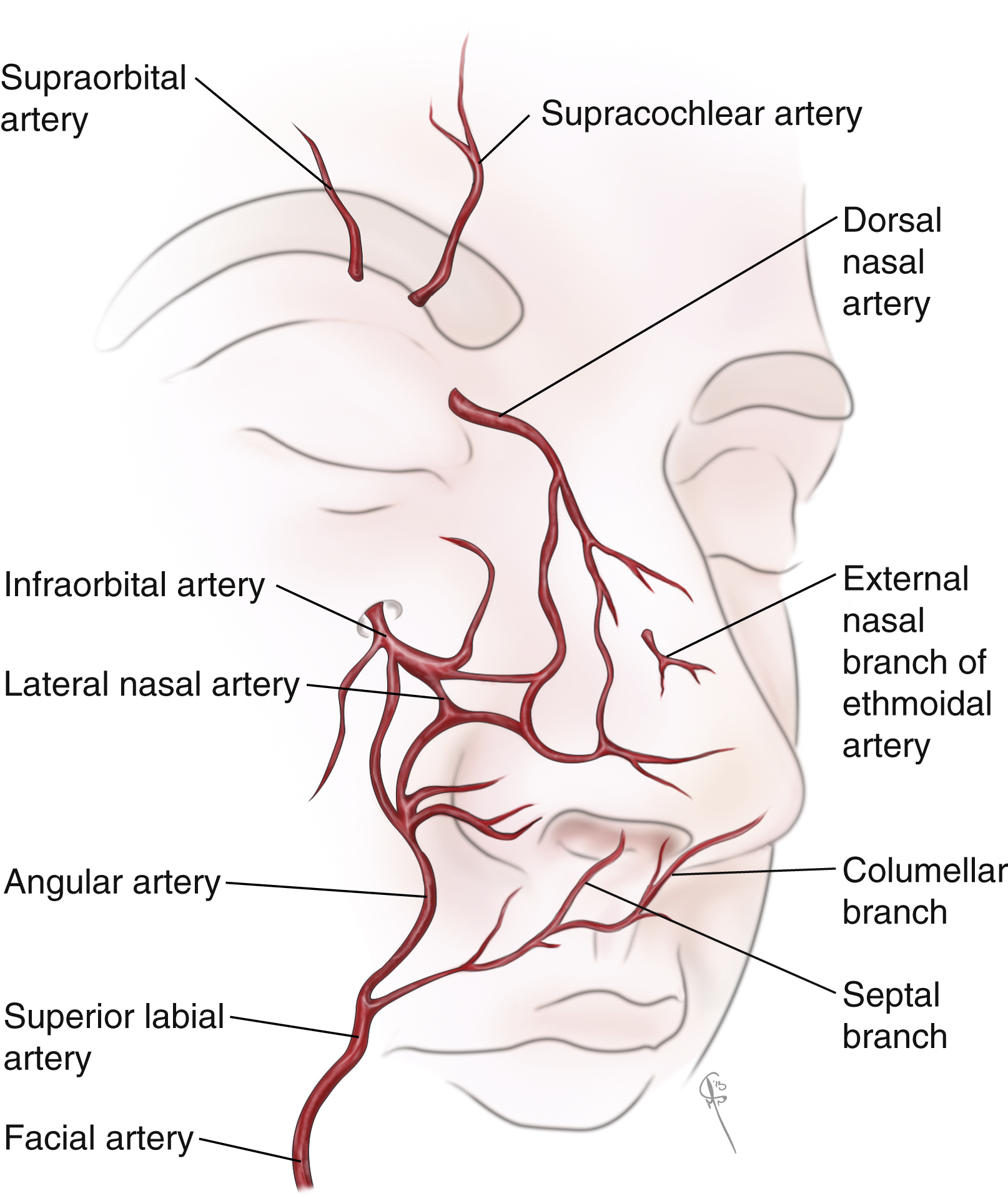 Understanding the blood supply of the nose is important in order to avoid ischemic consequences if this rich blood supply is inadvertently and sufficiently disrupted. The dorsal nasal artery, a branch of the ophthalmic artery, penetrates the orbital septum above the medial palpebral ligament and courses along the side of the nose, providing robust blood supply to the dorsal nasal skin. It ultimately anastomoses with the lateral nasal artery, a branch of the angular artery (itself the terminal branch of the facial artery), with numerous branches that enter the subdermal plexus thereby supplying the lateral surface of the caudal nose. The tip of the nose is supplied both by the external nasal branch of the anterior ethmoid artery (a branch of the ophthalmic artery), the columellar artery (a branch of the superior labial artery), and branches of the lateral nasal artery. The external nasal branch of the anterior ethmoid artery passes between the nasal bone and the upper lateral cartilage to supply skin of the nasal tip. Branches of the superior labial artery supply the nostril sill and columellar base ( Fig. 68.3 ). Intranasal blood supply is from branches of the anterior and posterior ethmoid arteries, the superior labial and greater palatine arteries, and the maxillary artery.